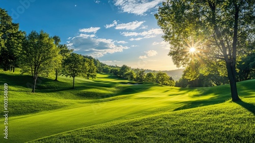 Lush green golf course fairway under a sunny sky, surrounded by trees and rolling hills. Idyllic landscape for golf lovers.