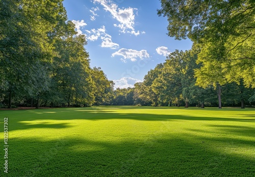 Lush Green Lawn Surrounded by Tall Trees Under a Bright Blue Sky with Soft White Clouds in a Picturesque Outdoor Setting