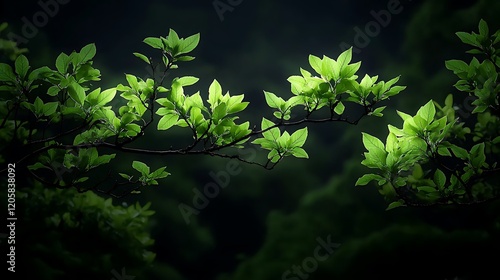 Lush green leaves illuminated by soft light against a dark forest backdrop, creating a serene atmosphere