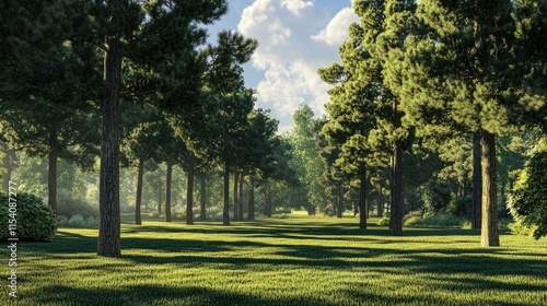 Lush green pines lining a serene park pathway surrounded by vibrant foliage and dappled sunlight creating a tranquil outdoor atmosphere