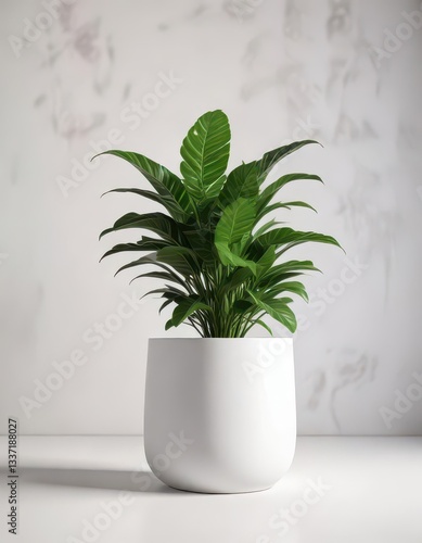 Lush green plant in simple white pot, vibrant foliage , photography, background