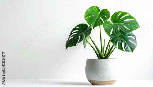Lush green plant with distinctive leaf cutouts in a speckled pot against a white wall