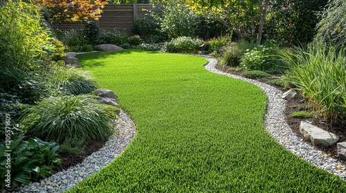 Lush green synthetic grass creates a winding pathway through a meticulously landscaped garden filled with vibrant plants and flowers, illuminated by the warm afternoon sunlight