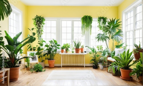 Lush Indoor Garden in Bright Yellow Room with Sunlight Streaming Through Windows