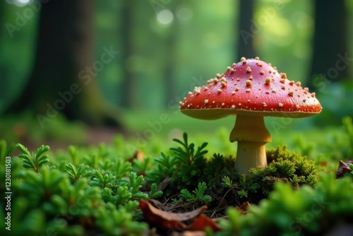 Lush spruce needles surround a large mushroom, greenery, forest floor, spruce