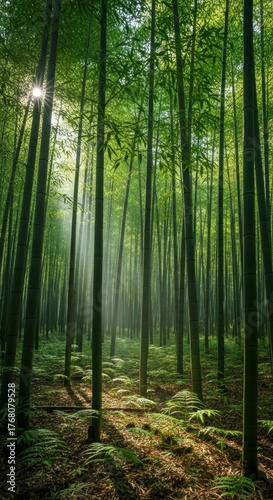 Lush, sunlit bamboo forest with towering stalks and dappled light on ground