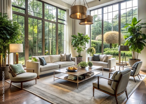 luxuriant minimalism serene afternoon UCLA interior design fusion eclectic furnishings metallic accents verdant greenery abundant natural light soft focus subtle shadows modern elegance