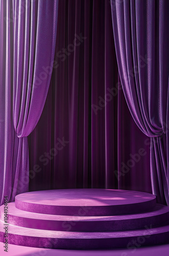 Luxurious and Bold 3D Rendered Podium with Lavish Plum Curtains for a Rich Display