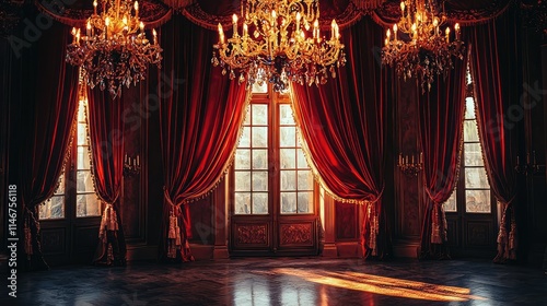 Luxurious and Elegant Grand Interior Featuring Rich Red Drapes, Ornate Chandeliers, and Sunlight Streaming Through Large Windows in a Historical Setting