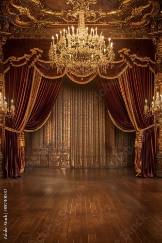 Luxurious Ballroom Stage. An elegant ballroom with a grand chandelier hanging from the ceiling, soft golden lighting, and polished wooden floors.