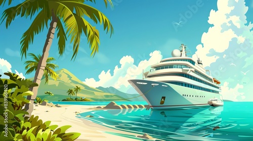 Luxurious Cruise Ship Docked at Serene Tropical Island Harbor on a Bright Sunny Day