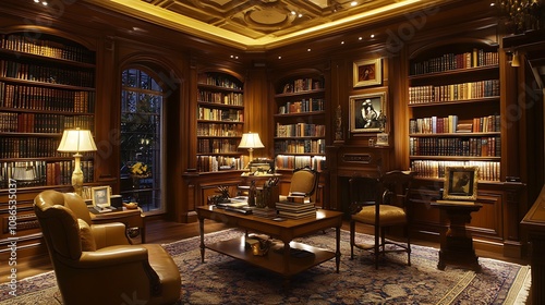 Luxurious, dimly lit library with rich wood paneling, leather chairs, and extensive book collection.