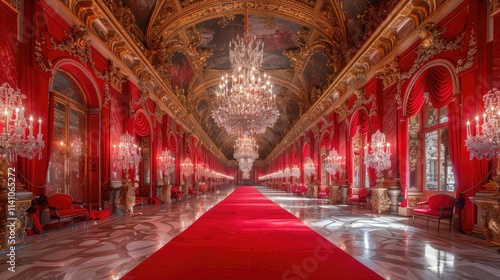 Luxurious hall adorned with red decor, chandeliers, and a grand carpet, showcasing opulence.