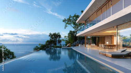 Luxurious infinity pool villa overlooking the ocean. Modern architecture with panoramic sea view. Concept of luxury vacation, real estate, dream home.