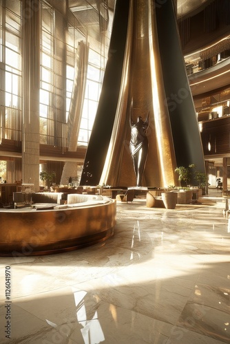 Luxurious Lobby with Towering Atrium and Warm Lighting