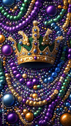 Luxurious Mardi Gras Crown with Colorful Beads and Jewels. Concept of Festive Celebration Opulence Royalty Rich Traditions. Vertical