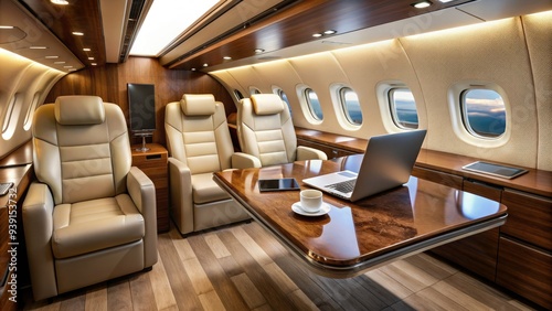 Luxurious private jet interior with laptops and computers scattered across polished wood table, surrounded by plush leather seats and sleek metallic accents.