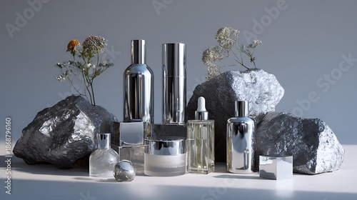 Luxurious skincare products in modern silver and clear glass bottles with rocks and flowers on a gray background for natural beauty and wellness advertising