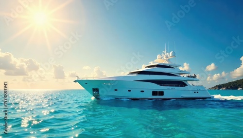 Luxurious White Yacht Sailing on Turquoise Ocean Under Vibrant Summer Sky Idyllic Relaxation and Opulence