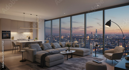 Luxury Apartment Interior With Skyline View During Evening Twilight