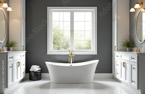 Luxury bathroom interior features freestanding bathtub by large window. Modern house design with white double vanity cabinets, gold fixtures. Elegant room dark gray walls, white marble floor. Clean,