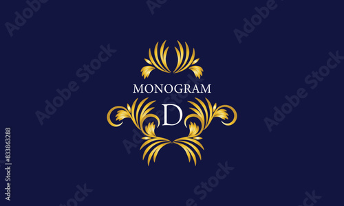 Luxury emblem monogram logo with initial letter D. Ornate gold frame illustration. Invitation, wedding, label, restaurant, heraldry