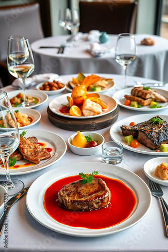 Luxury Fine Dining Restaurant Table with Gourmet Dishes, Wine Glasses, and Elegant Plating — Upscale Culinary Experience
