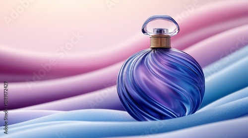 Luxury fragrance bottle on a soft pastel fabric with delicate wavy texture