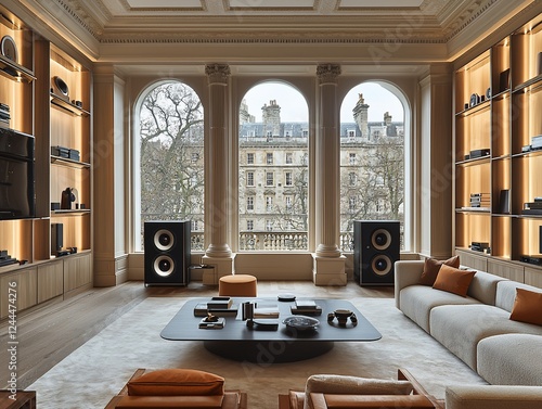 Luxury London showroom, audio system display, city view, relaxing ambiance, home theater