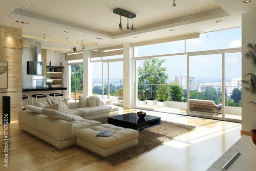 Luxury Modern Open Plan Living Room with Panoramic Windows and Sleek White Interiors
