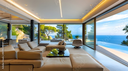 Luxury villa with terrace and floor to ceiling panoramic window with amazing sea view. Interior design of modern living room