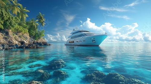 Luxury yacht anchored in a tropical bay with clear turquoise waters and a small island with palm trees.