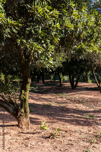 Macadamia nuts on the evergreen tree, macadamia plantation in Brazil