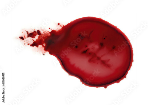Macro closeup illustration of a vivid blood red stain resembling a cell, prominently standing out on a pristine white surface. Generative AI.