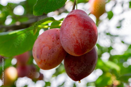 Macro growing plums on branch tree in orchard and berry garden. Berry garden seasonal