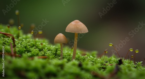 Macro photograph, forest floor, delicate mushrooms, soft lighting, moss carpet, earthy tones, shallow depth of field, misty atmosphere, tiny organisms, nature details, fairy tale ambiance, damp enviro