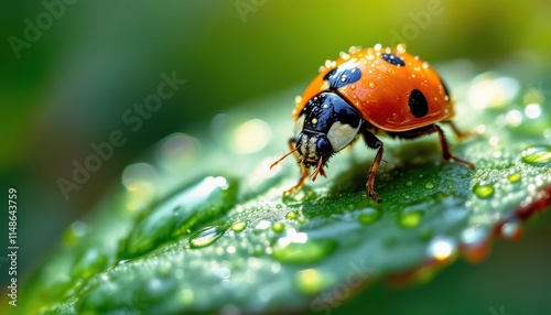 Macro Photography of a Ladybug on a Dew-Covered Leaf in a Lush Green Garden