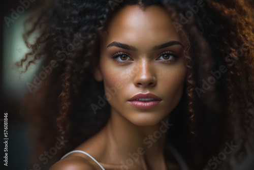Macro shot of a gorgeous woman with natural curly hair cascading down her shoulders and framing her stunning face with soft, subtle makeup and a sweet smile, generative ai