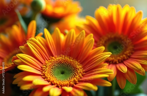 Macro shot of vibrant gerbera daisies in full bloom rich orange, yellow petals. Center of flowers displays intricate green seed patterns. Few green leaves add contrast. Ideal for nature, beauty,