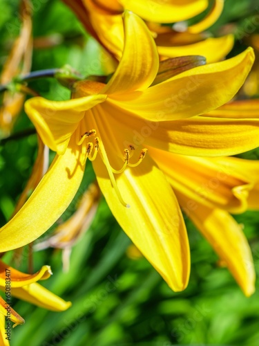 Macro view of a bright yellow daylily flower in full bloom, with vivid colors and intricate details