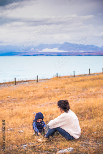 Madre con hijo sentada junto al lago