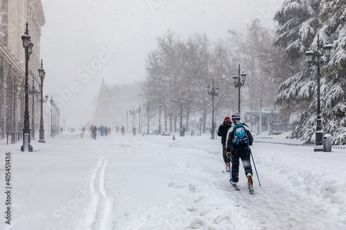 MADRID, SPAIN - JANUARY 09, 2021 - people enjoying the streets of snow, in the city of Madrid, covered by the storm philomena, january 05, 2021 in Madrid