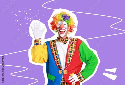 Magazine cutout of happy clown waving on violet background. Stylish poster