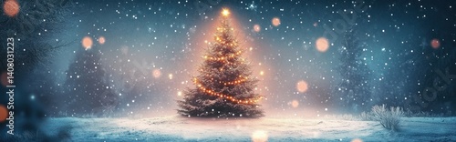 Magical Christmas Tree in Snowy Landscape with Starry Sky and Bokeh Lights