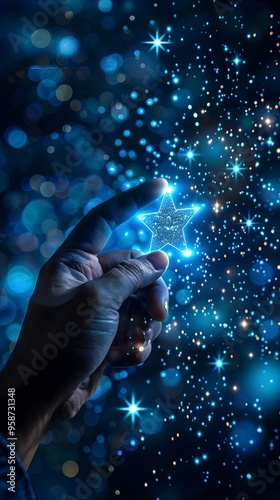 Magical Hand Conjuring Glowing Star in Sparkling Cosmic Galaxy