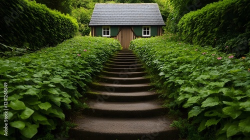 Magical Path Leading to a Hidden Forest Cottage with Overgrown Wildflowers and Ivy