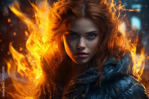 Magical woman summoning fire. Beautiful shamanic girl playing on shaman frame drum in the nature. Generative AI.