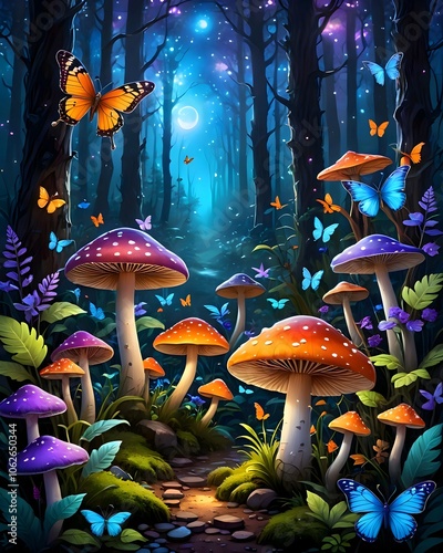Magical woodland scene featuring vibrant mushrooms and butterflies, all lit by ethereal moonlight.