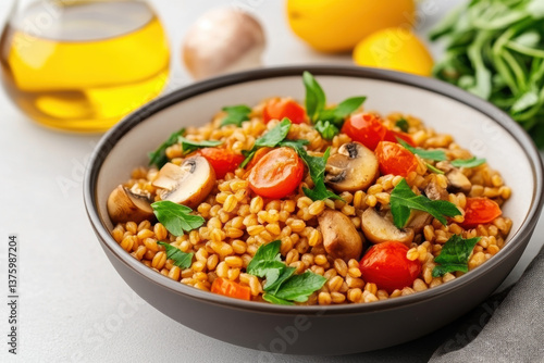 Magnesium in Food, A bowl of cooked farro topped with roasted mushrooms, showcasing a high-fidelity food image for culinary use.