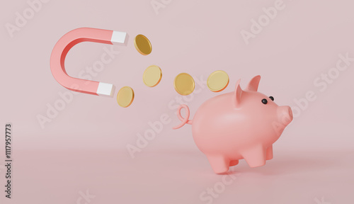 Magnet attracts money coins from the piggy bank, attracting, Savings withdrawal, investment and financial growth concept